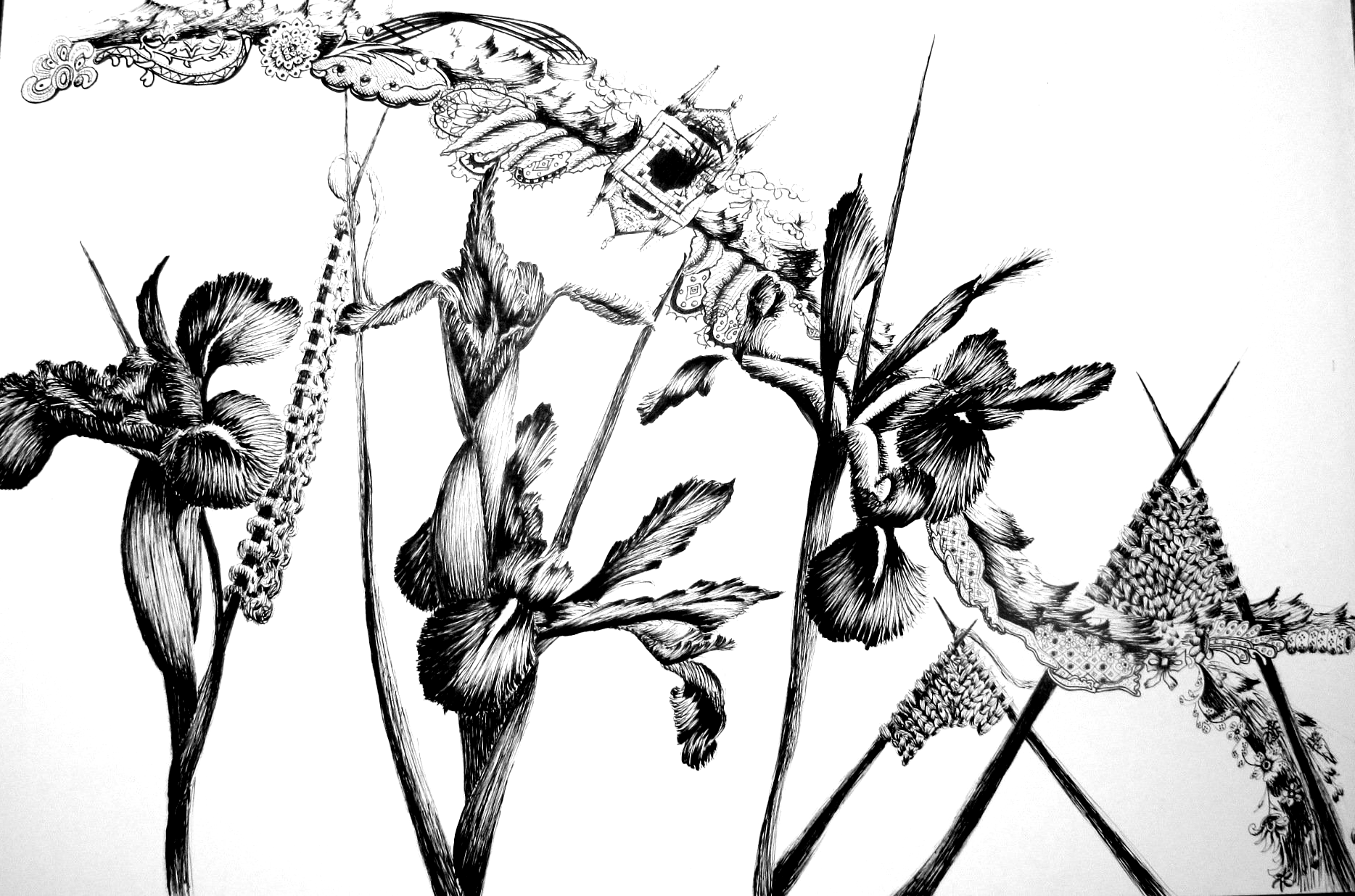 In these drawings, lace and flowers are a touchpoint in the exploration of the complicated histories of Europe and the Americas.